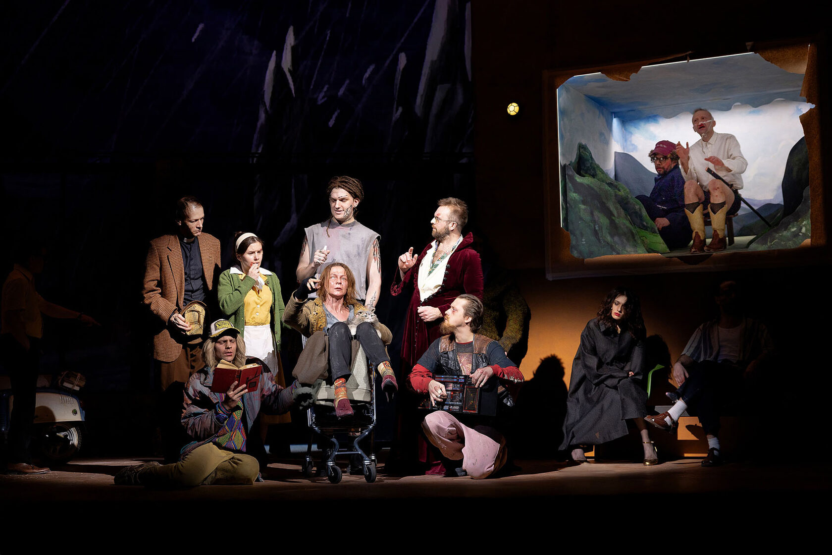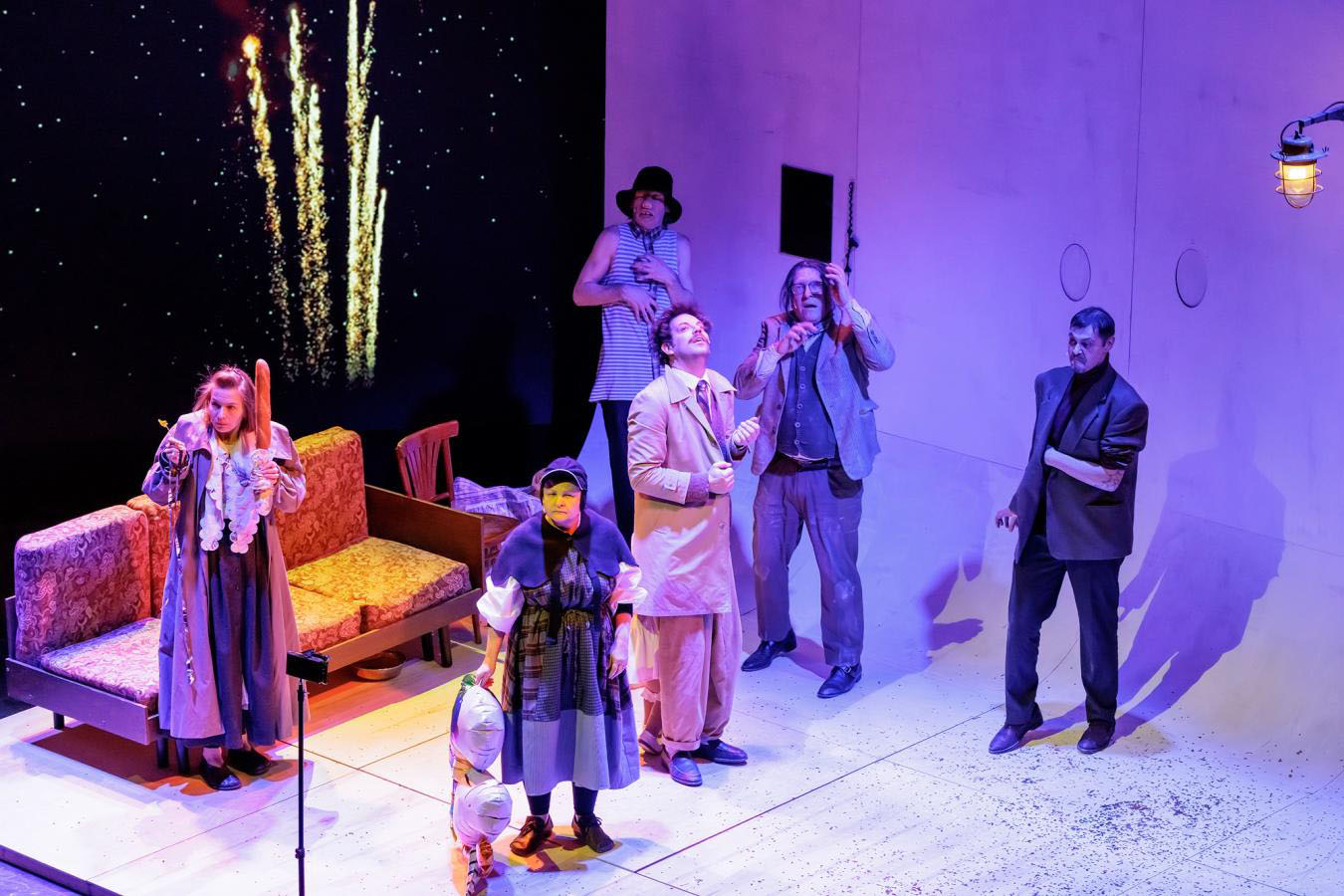 Главные действующие лица выглядят непривычно, но их облик — точная метафора, придуманная при внимательном и добром всматривании в привычных персонажей. Образ Башмачкина (актер Сергей Шайдаков) в «Шинели» в московском театре «Пространство Внутри» — неожиданный и убедительный. Акакий Акакиевич буквально «маленький человек», хозяйка-нянька помогает ему «попысать» в горшок, говорит о нём как о дитяте: «проснулось, покушало, пришло». Взгромоздившись на ходули «величия» (которые ему подставил Гоголь), он выглядит огромным, хотя, по сути, беспомощный и жалкий. Башмачкин не соразмерен ни своей крошечной каморке, ни «Невскому — Достоевскому», где ветер треплет его, как огородное пугало. Его мир — это рабочий стол с циркулярами и крючкотворством, только там Акакий Акакиевич «Богом поцелован».
